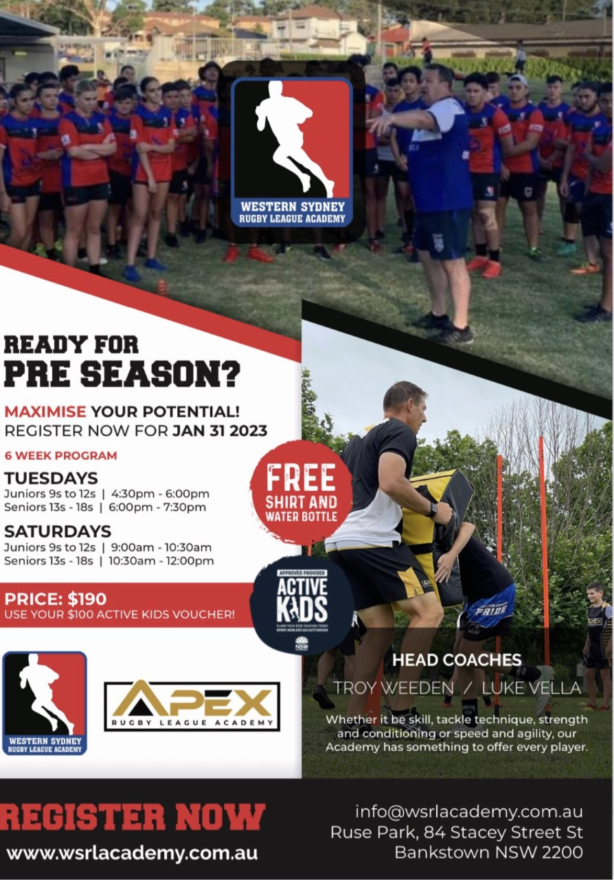 The Western Sydney Rugby League Academy (WSRLA) will resume on Tuesday, 31st January 2023. The academy in the 2023 season will be led by our newly appointed Head Coaches, Troy Weeden and Luke Vella.